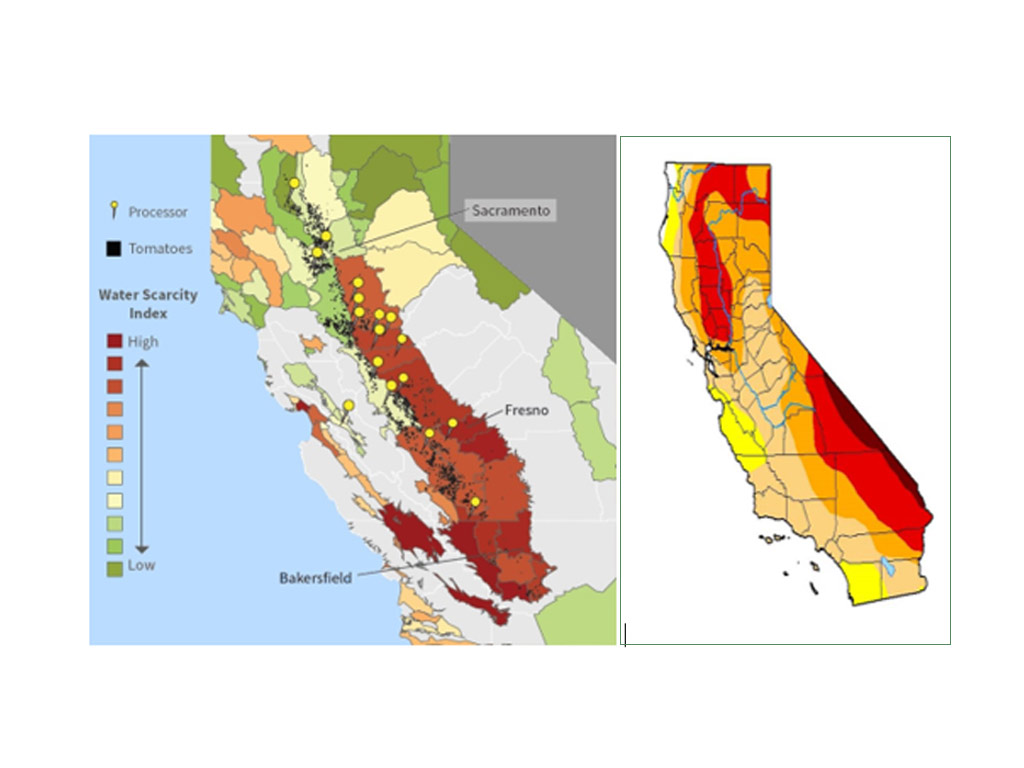 Figure1. Map of water scarcity across the California state and zones with different drought intensity. The location of most tomato production and processors is in the San Joaquin Valley in water-stressed areas. (Adapted from: https://www.farmwater.org/cfwc-blog/ and https://droughtmonitor.unl.edu/)