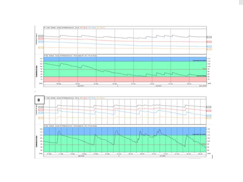 Figure 2. Water infiltration results: on the upper (A) graph the previous conditions low and slow infiltration rate, bottom graph (B) show faster and deep infiltration rate after Kyminasi Plant Booster technology use