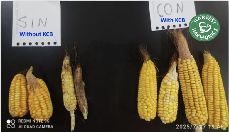 Ear Fertility and Filling: KCB-treated ears produced more kernels,with 11–12 rows per ear and 295–321 kernels per ear, indicatingimproved grain filling and higher yield potential compared to the control.