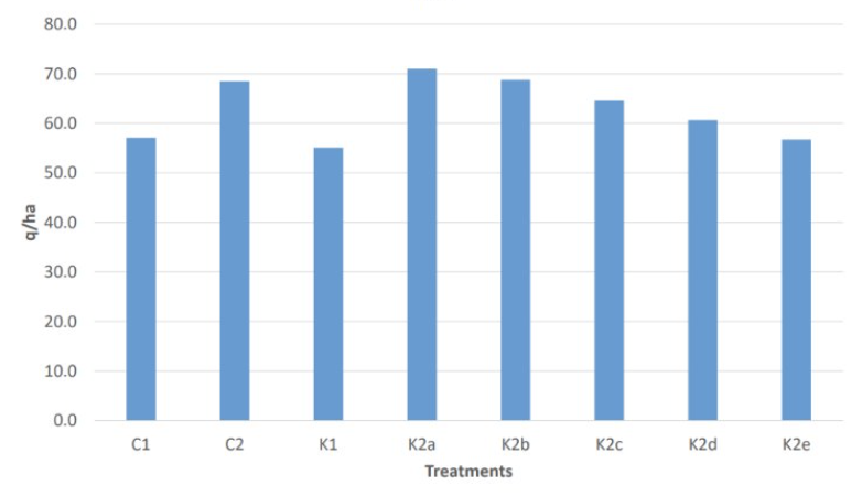 - Yield: K2a produced a 3.6% higher yield than the conventionalplot while reducing fertilizer use by 10%, whereas K2b achieveda slightly higher yield than conventional with a 25% fertilizerreduction