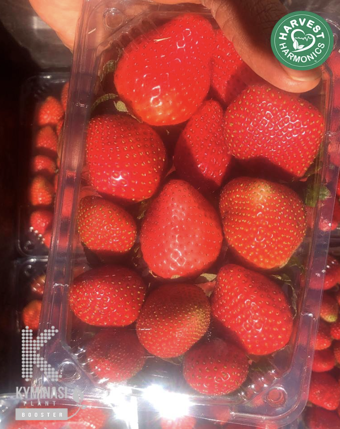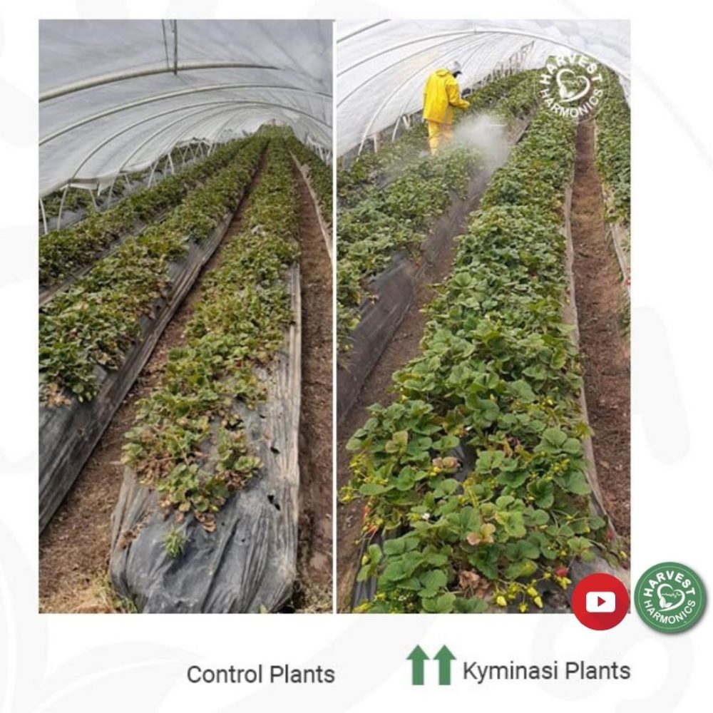 The farm experienced an extreme summer with very intense heat. After using Kyminasi Plants Crop BoosterTM for just one month, the results were already fantastic! The strawberry plants that were treated with KPCB had healthier and brighter green leaves as compared to the control field that had highly heat-stressed plants. The KPB-treated strawberry plants began producing fruit significantly earlier than the control plants. As a result of these incredible results, the farm owners decided to buy the Kyminasi Plants Crop BoosterTM for the rest of their field.