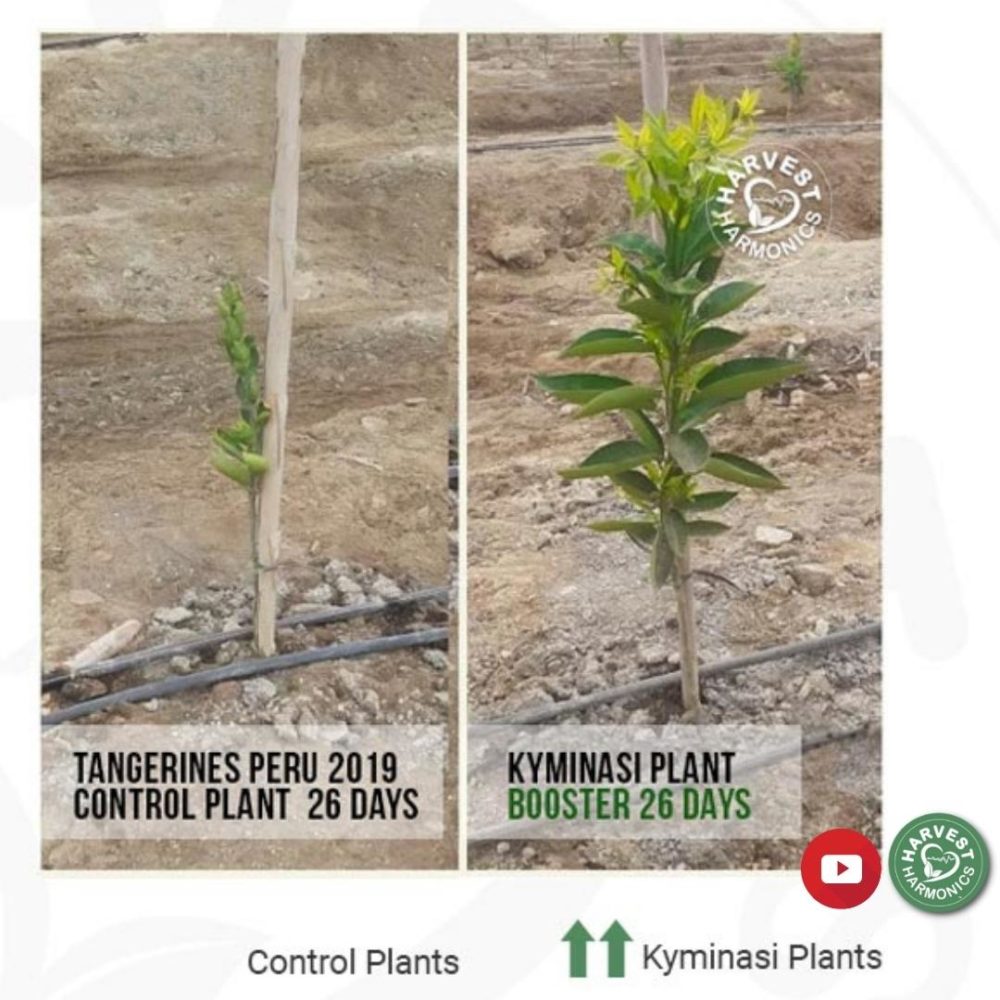 Details: The Kyminasi Plant Booster (KPB) technology was installed at La Calera Farm in Peru on 1.5 hectares (3.75 acres) of a tangerine grove in December 2019. La Calera has over 4,500 hectares (11,250 acres) of citrus, avocados, table grapes, pomegranates, and other fruit. The tangerine seedlings were about one month old when the scientific trial began.